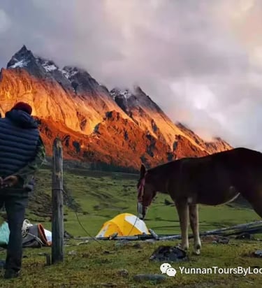 Hike for approximately 5-6 hours across pastureland and along the ridge of the high mountain to the Black Sea, at around an altitude of 4,100 meters. This area is one of the most stunning and intriguing spots. Enjoy the view of Haba Mountain, then camp and cook here.