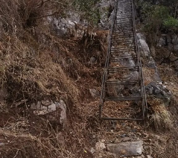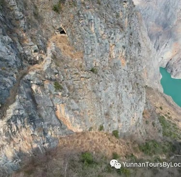 The rocky path along the mountain edge, high above the river.