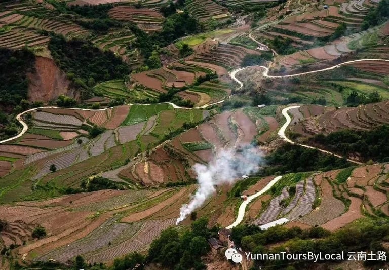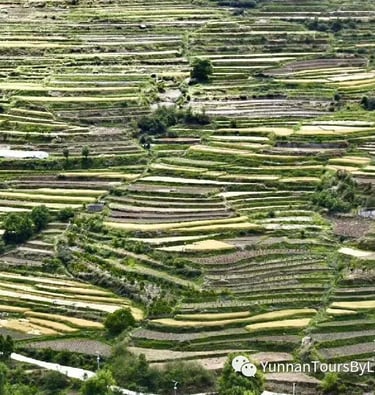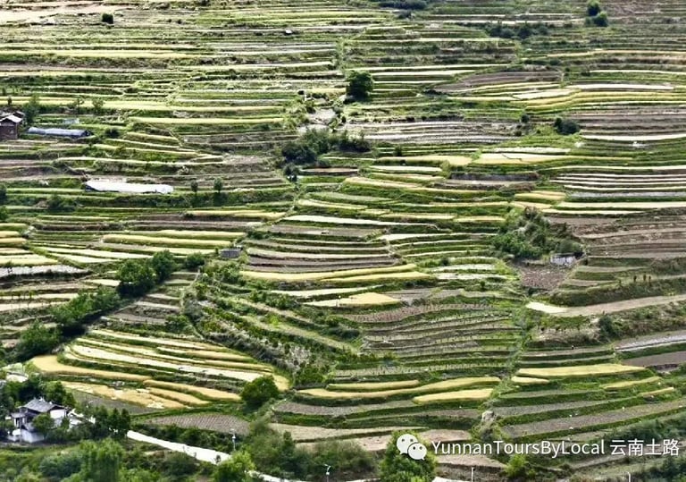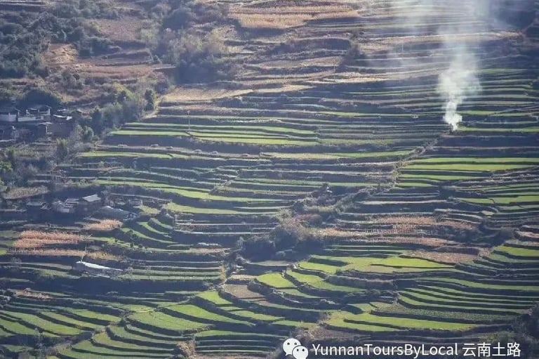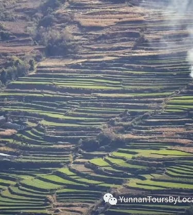 It's a big day! Start hiking from Baoshan and climb for about 4 hours through terrace fields, villages, and along a muddy or rocky path high above the Yangtze River. Cross through stone channels with a torch. Have a picnic lunch on the way. Then continue walking for nearly 3 hours on a flat or downhill track to a small village, home to only three families, and stay overnight in a local Naxi family house that has no Wi-Fi. Enjoy the peace and quiet with only the stars overhead. Sleep in dorm beds with shared showers and a country toilet. Walk through small villages, meeting cows along the way, and pass magnificent terrace fields.